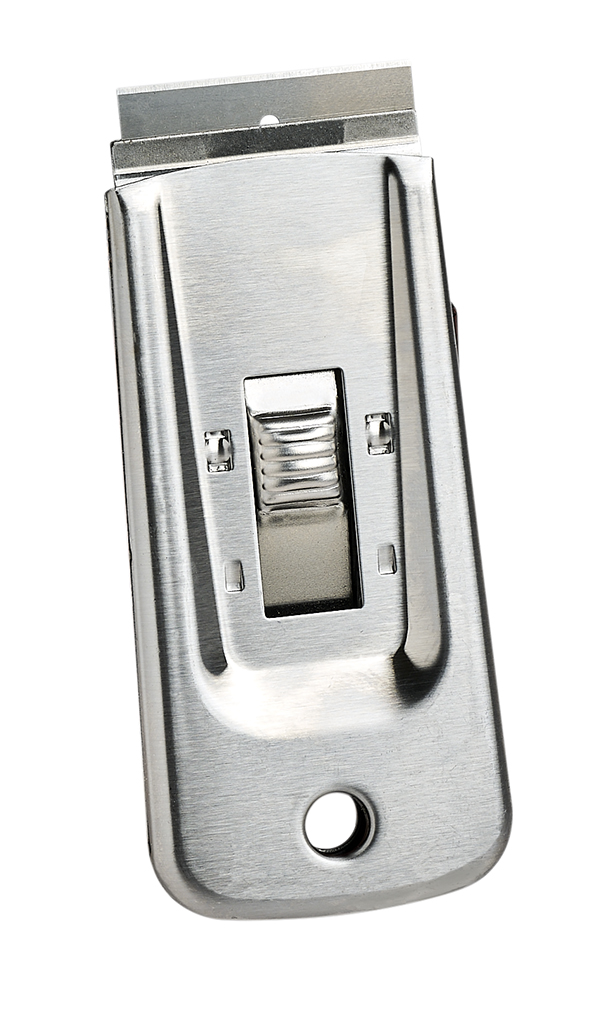 Economy Safety Scraper 1 1/2″, This heavy-duty, all-steel scraper has a retractable blade and a safety mechanism that keeps the blade from sliding out while in use. Sharp and easy to handle, it can remove adhesives and sticky residues whitout damaging the surface. The compacts size of this scraper makes it easy to carry around in your tool box or work belt. Also available in a very sturdy 1-1/2″ Professional Safety Scraper format. Need to change your blade? Purchase your Safety Scraper Razor Blade Refills in packs of 100 or 5.