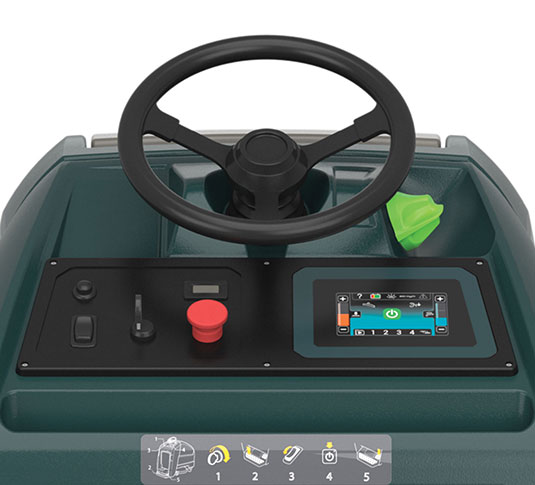 - Operate comfortably and easily with ergonomics and controls designed for a stand-on scrubber.
